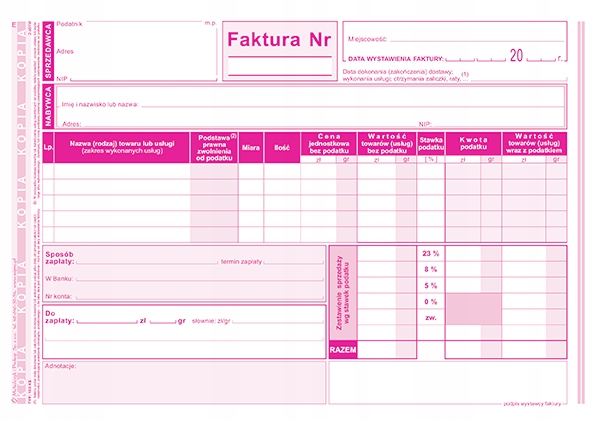 - Zastosowanie: faktury i inne dokumenty wynikające z przepisów o podatku od
