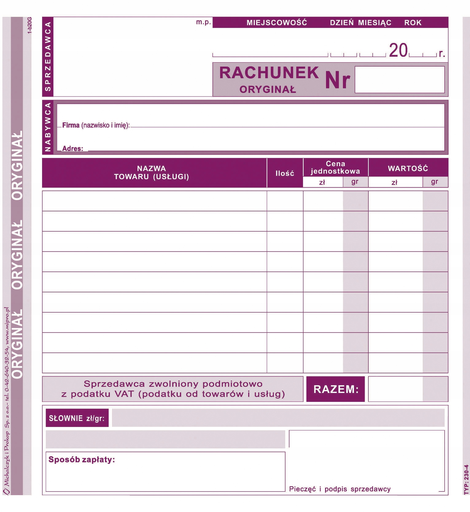 • Zastosowanie: rachunki i inne dowody sprzedaży.