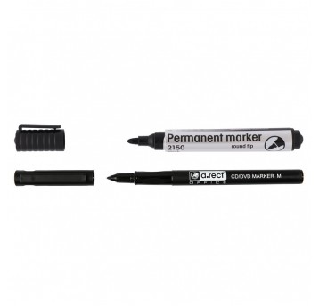 2. Marker z wodoodpornym, nietoksycznym, szybkoschnącym tuszem w kolorze czarnym, przeznaczony do opisywania płyt CD/DVD. Nadaje się również do pisania po innych materiałach, takich jak: szkło, plastik i folia. Wyposażony w plastikową obudowę oraz wentylowaną skuwkę z klipsem. Linia pisania: 1 mm.
